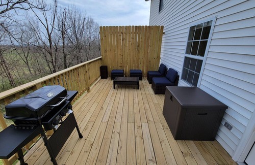 Outdoor Space: A spacious deck that includes a hangout area and a grill to enjoy with family or friends.