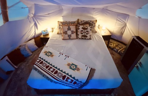 The two Tipis at Hozhoni create a single suite - Tipi I has a queen bed, air conditioning, mini frig, microwave, coffee maker and Alexa for music. Tipi II is a bathroom suite that includes a jetted bath with bubbles and night lights! The Tipis at Hozhoni are "on the beaten path" - next to our glampominium.
