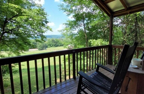 The real highlight is the covered back porch, complete with rocking chairs and sweeping views of the pastures and rolling hills. Guests love starting the day here with coffee in hand, or winding down with a glass of wine while watching horses graze and deer wander by.