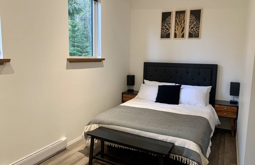 The Treehouse is new open concept suite with high ceilings and lots of light with a full kitchen with all the amenities. It has a large deck with a private jacuzzi hot tub over looking the forest. We are 15 minutes to Nelson and 30 minutes to Whitewater ski hill. 4X4 is a must Oct-Mar
