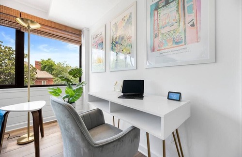 Since you're the "work from home" type, you grab your laptop and sit at the desk in the comfy work chair. You quickly get on our ultra fast high speed internet to get some work done when you realize you need to leave by a certain time. You notice that there is a smart assistant clock on the desk and ask it to set a reminder to leave in case you forget what time it is and don’t have enough time to shower.