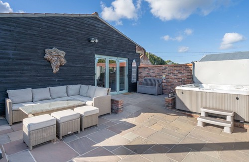Enclosed with a 6ft wall to separate the area from the rest of the site and then 3.5ft fencing/wall all round to allow uninterrupted views across the fields. Tucked privately into the corner is the five-seater HOT TUB, very well maintained with the resident rubber duck bobbing about! The views from the hot tub are uninterrupted and across the fields where buzzards, hares, deer and owls can be seen and heard. Imagine watching the sunrise and moonlit nights all year round. There is enough seating for nine at the outside coffee table which converts into a dining table for al-fresco eating. There is a parasol in the courtyard and paddock.