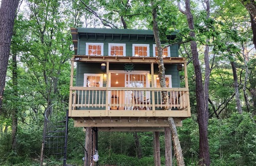 This is a 1 of a kind custom built tree house. It is specifically designed to help you escape the city and reconnect with nature! Features one full size queen bed in the loft as well as full size futon for extras guest. There is a full size shower and toilet with hot and cold running water. The kitchen features a microwave and mini fridge as well and basic dishware and cooking supplies. Outside, there is a lighted sitting area with a propane fire pit and picnic table. A short walk away there is our private dock featuring lounge chairs, a hammock, and a propane grill. Down on the shore line we have a small sandy beach area with 2 kayaks for Guest to explore beautiful Hungar's creek. Guests park a short distance away and will have full access to a golf cart to take them to and from the parking area.