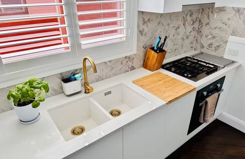 In the living room you will be able to enjoy a round dining table to seat 6 and a large comfy plush sofa. The 65 inch Samsung smart TV allows you to access Netflix, Apple TV, Paramount, 7Plus, 9Now, Ten Play and many more.