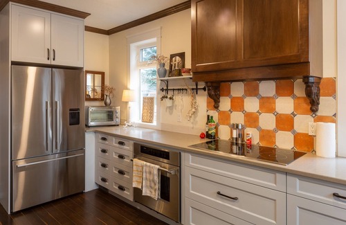 We have lovingly restored this 117 yr-old home and added coffered ceilings, warmed porcelain floors, a modern Italian kitchen, salvaged brick chimney, and glistening chandeliers.