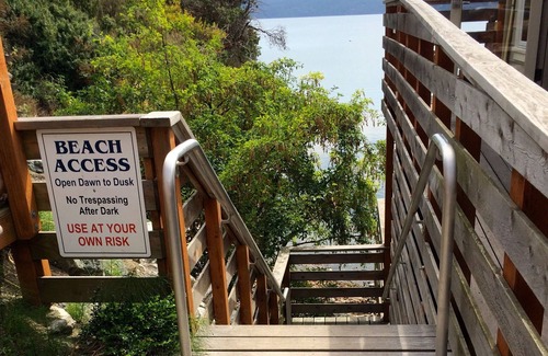 Gaze at stunning views down East Sound from this beautiful condo perched right on the shore! SeaStar Lofts offer the only accommodations directly on the waterfront right in the heart of Eastsound Village, with waves lapping at your doorstep. The Windward Studio is one of four guest apartments in the brand new Main Street Station, designed to complement beloved historic structures of Eastsound. This is a premium unit, with spacious open floor plan of 430 square feet, queen bed, pull-out sofa, fully equipped compact kitchen, view balcony, and nearby stairs to the gorgeous rocky beach. Architecturally crafted with attention to every detail, and all new furnishings in coastal, organic style we call 'beachy elegance.' The rooms highlight natural textures and products from local artisans. In Eastsound Village you will find all you need -- farmer's market, bookstore, kayak rentals, bicycles, grocery, natural foods, boutiques, gift shops, and more. In fact, you don't even have to bring a car! Skip the ferry lines and pack light, take a shuttle or taxi to Eastsound, and the rest of your trip is easy. Feel free to ask us for any other special details you may desire for your get-away. Simply the perfect spot for your Orcas Island adventure! This unit can adjoin to our Leeward Studio for two couples or families that want more room. (See VRBO listings 419265, 418375 and 420677 for more options and group possibilities). Please note that we thoroughly disinfect our units between guests.