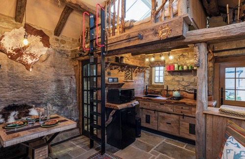 Bedroom: Galleried, Double (4ft 6in) Bed. Heating via wood burner, gas, electricity, bed linen, towels and Wi-Fi included. Logs for wood burner included. Welcome pack.. Front garden. Rear lawned garden with patio and garden furniture. Private parking for 1 car. No smoking.. Nestled against an ancient rock on the edge of Ilkley Moor, lies a unique cottage. The Woolcombers has been gently converted from an 18th-century woolcombers shop into a small but perfectly formed getaway for two. Situated on an old pack horse route and surrounded by open countryside, this retreat really is one of a kind. For those seeking an escape from the hustle and bustle of everyday life in a setting of outstanding natural beauty, The Woolcoombers will offer just that. It has been lovingly restored keeping all its original charm and character, whilst tastefully incorporating all the modern facilities of today. With a magnificent stone fireplace and wood burner, the cottage oozes rustic charm and warmly embraces you as you step over the threshold.