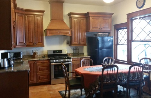 Barn style Old Railroad Boarding House and Hotel Converted into Apartments Upstairs, Vacation rental Downstairs . One block Off Main Street in Three Forks Montana, 28 minutes to Bozeman Montana ,90 miles from Yellowstone National Park . One block from historic Sacajawea Hotel with 5 star Dinning ,bands and dancing Friday and Saturday nights. Blue Ribbon Fishing abounds with the Jefferson, Madison and Gallatin River converge to form the Missouri River At Headwaters state park. Also with in a few miles is Lewis and Clark Caverns.One of the bedrooms has a queen size bed and a personal 3/4 bath with a neo angle tiled shower,toilet and pedestal lav, the other bedroom has a queen size bed with shared full bath with 6 foot long bathtub and shower toilet and pedestal lav down the hall. 10 foot high ceilings through out , large living room with queen size fold out futon and a couch could be used for additional sleeping of one person ,love seat and rocking chair 42"flat screen TV direct TV HBO and other channels . Beautiful new kitchen cabinets ,granite counter tops, dining room table for six. Four season front porch with sitting area and workout area on other side stair master free weights and cable weight machine. Coin operated washer and dryer in common area along with with access to common outside red wood deck and barbecue grill. Hi speed unlimited internet acess