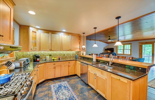 Revel in relaxation at 'Moose River Lodge,' a rustic retreat in Upstate New York. This 4-bedroom, 3.5-bath vacation rental in Thendara offers natural seclusion within easy reach of Old Forge. Families can delight in the cabin's spacious layout with a game room, screened porch, and the backyard nestled along Moose River. Enjoy a hike, go fishing or boating on a nearby lake, or hit the slopes at McCauley Mountain Ski Center! Later, you can watch the sunset on the patio.