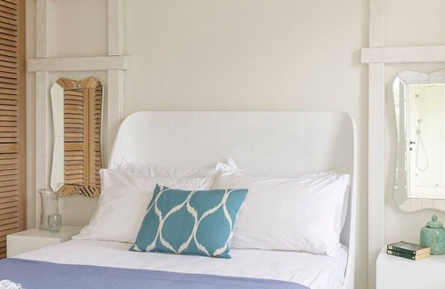This Bright Award Winning Classic Cycladic Modern Designed Villa is the perfect summer home! Boasting a private pool with plenty of garden space. This home can host up to 10 guests. The living room open kitchen leads into the garden where you have tanning beds and a private pool! The 3 bedrooms and 3 bathrooms are situated upstairs. with a large balcony space. Downstairs you have another bedroom and bathroom with plenty of storage space. This location is the best there is. Wifi&TV available.