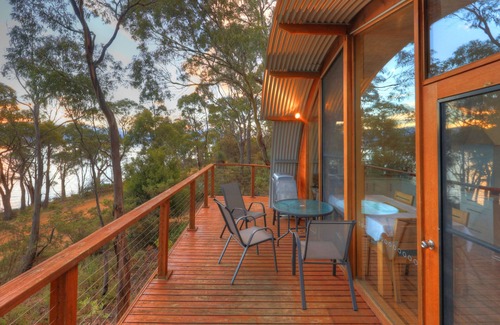 Watch dolphins, seals, penguins, white-bellied sea eagles and wedge-tailed eagles from the deck while quolls, echidnas and wallabies also abound.The timber deck wraps around to an accessible entrance ramp on the side.