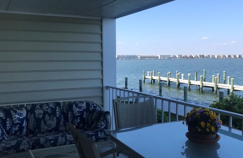 No need for a car- Located directly on the Bay, walk to Beach, Boardwalk, OC Convention Center, Jolly Rogers Amusement Park, Putt-Putt Golf, grocery store, and tons of restaurants! Located in Thunder Island - Private Community. Across the street from Castle in the Sand Hotel and next to the Convention Center. 2 Bedroom, 2 Full Bath Condo on Ground floor overlooking the Bay. Amazing Sunset views!! Queen Bed in each Bedroom, with bedding. Two newly renovated Full Baths, one with large stand-up shower, other has shower with bathtub. Hair Dryers provided. Newly renovated kitchen with all cooking and eating necessities provided. Large open entertaining area with sectional couch, electric fireplace, and pub style dining area. Oversized porch with outdoor table/chairs and sitting area with gate access to go directly onto the docks. Washer and Dryer in unit. Wi-Fi included and TV/Cable in living room and bedrooms. Two parking spaces provided. Boat slips available. Fish directly outside the porch. Access to the outdoor community pool, and picnic area. This place is all about LOCATION- close to everything, but not close to the noise from any highway traffic or pedestrians. Available Year Round - great off season rates!