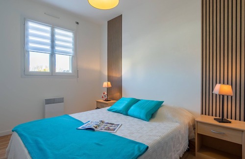 "Ti Ar Mor", 4-room house 80 m2. Bright, beautiful furnishings: living/dining room with open-hearth fireplace (only for decoration), dining table, satellite TV and flat screen. Exit to the terrace. 2 rooms, each room with 1 french bed (140 cm, length 190 cm). 1 room with 2 beds (90 cm, length 190 cm). Open kitchen (oven, dishwasher, 3 induction hot plates, toaster, kettle, microwave, electric coffee machine). Shower, sep. WC, double hand-basin. Electric heating. Large terrace 40 m2, south-west facing position. Terrace furniture, electric barbecue (portable), deck chairs (2). Facilities: washing machine, children's high chair, baby cot. Internet (WiFi, free). Please note: non-smoking house. Smoke alarm.