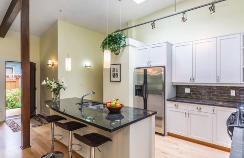 The deluxe kitchen features granite countertops and full size stainless steel appliances including a gas top range, electric oven, microwave, and dishwasher. The kitchen island seats 3 and the dining area seats 6 with table settings for 8. A full range of spices is provided.