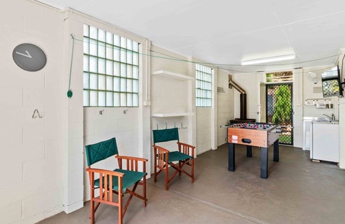 Downs stairs is equipped with a foosball table, tv and bar fridge.