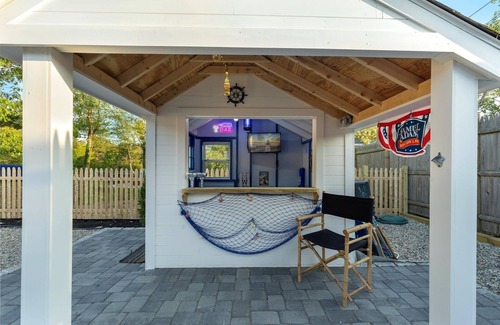 🛁 Relax & Unwind - Enjoy a Tiki Bar with TV in fenced private backyard. View of the pond, outdoor shower, grill and firepit.