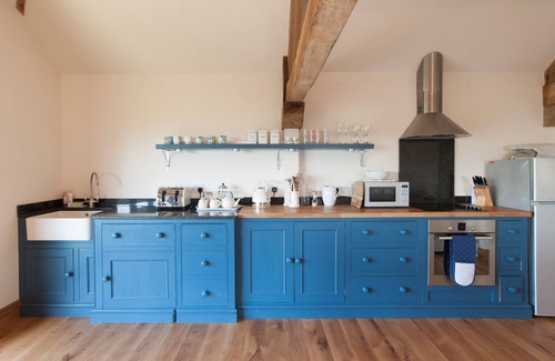 The kitchen and dining area is finished to a high standard. Beautiful oak cupboards topped with granite surfaces. There's a fridge and freezer, an electric hob, microwave and oven. We provide all your essentials for washing up, bin bags etc. We also provide plenty of storage, cutlery, crockery and pans.