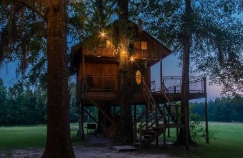 In the country and in the trees! This is the larger of 2 treehouses on the property. Similar to what you'd see in Treehouse Masters, it is air conditioned and has running water. Come enjoy the peace and quiet of Central Alabama farm land with plenty of room to stretch out and explore. It has a TV with local channels, small kitchenette area, bathroom with toilet and unlimited hot water.