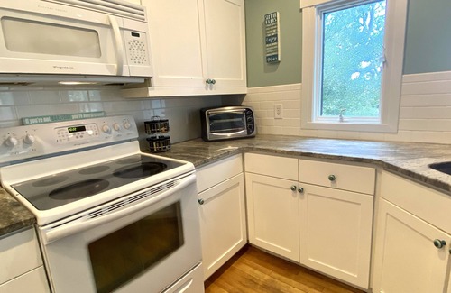 Inside, Timbercreek's warm hardwoods and beamed ceiling surround you and make the comfy gathering space feel even cozier. The open floor plan flows into the dining area that features a table comfortably accommodating 6. Adjacent is the breakfast bar which provides even more seating. The open kitchen, boasting plenty of granite counter-top space for food prep as well as an under-countertop sink, lets the chef cook and enjoy the group's conversation simultaneously.