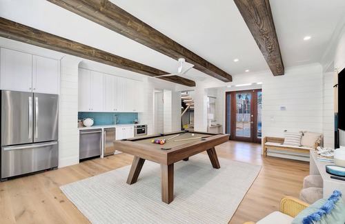 On rainy days, enjoy classic films in the third-floor theater room, which includes a wet bar for snacks and beverages conveniently located behind the plush movie theater seating. This level also houses a second primary bedroom with a luxurious spa-like ensuite bathroom, along with an additional king guest room sharing a bathroom with the theater. The bunk room caters to gaming enthusiasts, featuring a separate seating area and two twin-over-twin bunks behind a pocket door. The Third Floor also has two additional king bedrooms with ensuite baths.