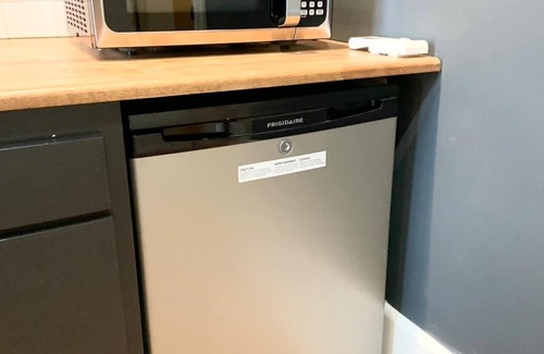 We named our place Remedies Inn in honor of the many family pharmacies that occupied the space since it’s birth in 1860’s. Soak in the history in your private two room suite. A king size bed in the private bedroom boasts a tempurpedic mattress with an extra thick mattress cover for comfort, a large antique dresser and a 50” smart TV. WiFi is complimentary. The living area features a kitchenette with fridge, microwave and coffee service, sofa and 43” smart TV. The bright white bathroom with classic white subway tile and black marble hex floor are refreshing and clean. Enjoy the walk in shower with provided shampoo, conditioner and body wash.