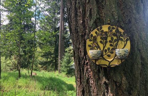 Getaway w/mountain valley views just min. from downtown PDX. Nestled by Powell Butte nature park on a private hobby farm, the A-Frame is cozy 240 ft, double bed perched under the old growth Douglas Fir's, sunset views of Portland. Enjoy a semi-off grid locale forest bathing or in outdoor soaking pool in the clawfoot tub (swap to nearby hot tub in winter) and our rustic outdoor bath house and compost toilet . It sits in a Mt meadow near our yurt and cabin, own private bath. Glamp adventure! Enjoy our cedar barrel hot soaking tub by RSVP.