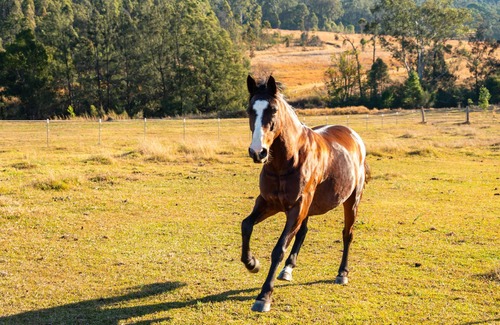 This tiny house provides an intimate setting amidst nature, with Tallawudjah Creek right outside your doorstep to the West. Nestled on a gentle pasture slope, the cozy 139-square-foot home boasts stunning views of the valley. The Equestrian Centre, arena, horses, and stables are approximately 300 meters away, enhancing the rural charm of the location.