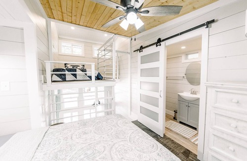 Tiny Home A has a full-sized bed, a pull-out couch, and a twin bed child bunk. The bathroom is on the 2nd floor.