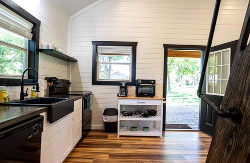 The living room exudes a modern farmhouse design, ideal for movies, games, or relaxation on a plush sofa. A dream Tiny Home kitchen, adorned with classic shiplap walls, is fully equipped with full-sized appliances, a fully stocked kitchen, and a stocked coffee bar. The dining table offers a perfect setting for meals.