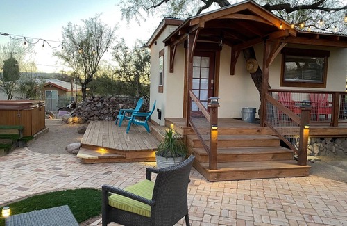 Our Tiny Home located in our back yard as our guest house is inside a private, well secured landscaped yard. Sofa / ottoman turns into FULL size bed, modern interior, great patio's with views and lots of character.