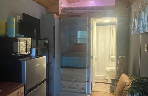 Our tiny house sleeps 3 with a queen bed in the loft and a twin down below. Fridge & freezer provided along with a kitchen sink, microwave & keurig with k cups. Relax & unwind semi off grid with no wifi (and sometimes little cell service) but enjoy a movie with the provided TV, DVD player and select movies available. Bring a board game or pick from the ones provided.