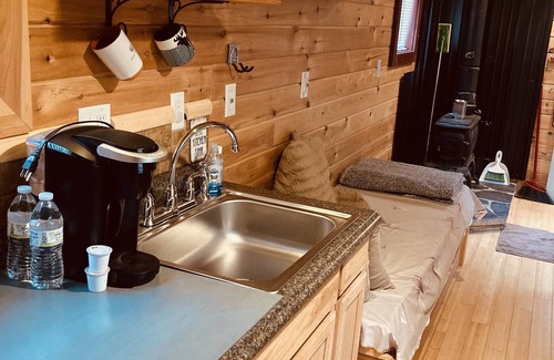 It's on 2 acres, 2 lakes nearby, hiking trails nearby, and it has an awesome deck which is a favorite of guests to relax and unwind in the sunshine. Shower, toilet, small kitchen, small fridge w/freezer, Keurig coffee maker, toaster, blender, Heatpump/AC. It has a sleeping loft with a full size foam mattress, also a day bed downstairs with a small foam mattress. The home has a dug water well which is great for showering, brushing teeth & washing dishes. Please bring & use bottled water for drinking.