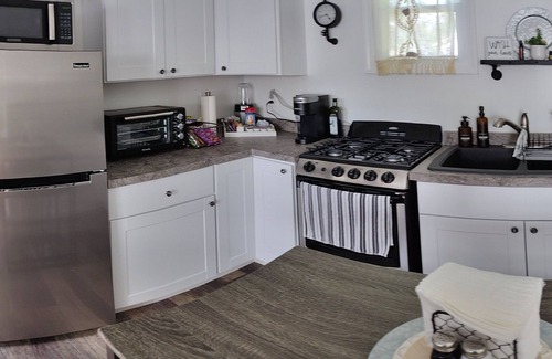 Our newly remodeled industrial/ farmhouse style tiny cottage offers a stress free tranquil retreat in the heart of Alden , NY, the original location of the Historic Black Water Baths. Our tiny 256 square ft. cottage is perfect getaway for 2. It's still comfortable for 4 if traveling with small children. The additional space in the lofted area has a full size futon mattress.