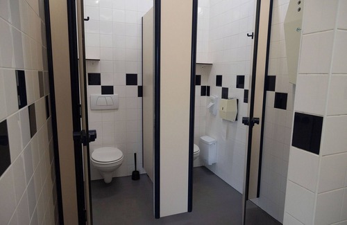 Nearby (>50 m) situated is the sanitary building with toilets, sinks and showers.