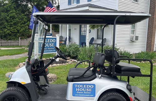 Toledo House Guest Suite A. Location, Location, Location. Newly remodeled, cozy suite with king sized bed, coffee bar, separate entrance with large front porch. 50" TV. Full size bath. Great location with off street parking. Adult Only. Compare our suites with others. Ours are much larger, extremely clean and updated. We also have golf carts available for rent at the Toledo House.