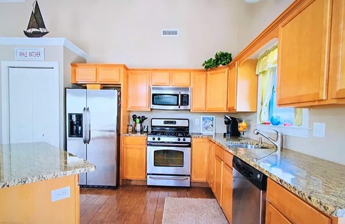 We have 4 bedrooms, 2 baths, and can sleep 10. Enjoy the open-concept great room, ideal for entertaining. The dining room, living room and kitchen area includes 2 sliders to the large outdoor deck where you can relax with your morning coffee or evening glass of wine. The great room features a large couch for movie nights, vaulted ceilings, gas fireplace and recessed lighting. The kitchen includes granite countertops, stainless steel appliances, large center island with seating, pantry, and upscale fixtures. Our kitchen comes fully stocked with everything you need if you get ambitious and want to cook.
