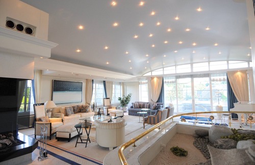 120qm Wohnzimmer, 10 Personen formelles Esszimmer, 3,50 Meter Deckenhöhe. Klimaanlage in allen Räumen .Süd-Terrasse / Profi-Wohnküche mit 8 Personen Marmor Esstisch, Schlafzimmer mit King- Boxspringbetten alle mit TV