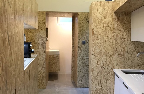 Based on an innovative renovation concept, this space is all lined with OSB, a raw material consisting of small pieces of wood and sustainable growth forests, which serves as a thermal and acoustic insulator. This allows the house to stay cool in summer and warm in winter with a high level of soundproofing.