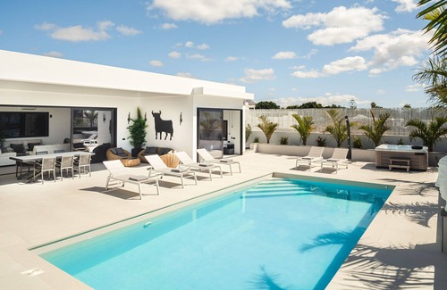 One of the villa's crowning features is its expansive outdoor area, where indulgence knows no bounds. Immerse yourself in pure bliss as you take a dip in the 10-meter-long heated pool, enveloped by the warm Lanzarote sunshine. For moments of relaxation, sink into the bubbling waters of the outdoor hot tub or unwind on plush loungers while savoring grilled delights from the BBQ area.