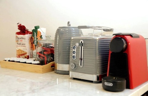 It measures 130 square meters and comprises an entrance hall, a living room, a fully equipped kitchen, a dining room, three bedrooms with king-size beds (70 in x 79 in), and one bedroom with a queen-size bed (63 in × 79 in). Each bedroom has its own bathroom with a shower. The apartment has free WiFi, a smart TV, air conditioning throughout, linens and towels, and a washing machine and dryer.