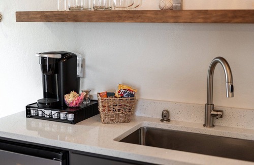 Inside, you will find everything you need to recoup from a full day in Fredericksburg. Upon entering the suite, the open concept welcomes you into the coffee bar with a bistro table to enjoy a cup of coffee from the Keurig or the living area where you can relax on a comfy seating group and watch cable TV. The bedroom area has a King sized bed with luxury linens that are changed out periodically according to the season. The wonderful walk-in shower is the focal point of the bathroom, but also provides robes to lounge around in.
