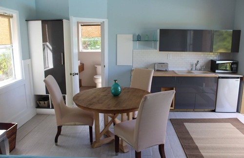 Elegantly furnished throughout, the house is inverted, with the great room and kitchen on the upper floor allowing wonderful views and breezes in the main living space. The kitchen is fitted with modern appliances and a large island with bar stools. Downstairs, the master bedroom has a king-size bed, Smart TV and spa-like ensuite bathroom with a claw-foot tub, walk-in waterfall shower and double sinks. The second bedroom also has a king-size bed, and has its own private balcony - perfect for morning coffee. The second bedroom can also be converted from a king-size bed to 2 twin beds.The guest bathroom has a walk in shower. There is private high speed internet throughout the house.
