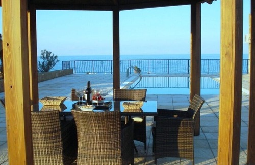 Special offers always available just contact us! Villa Leoneva is a traditional stone built 3 double bedroom villa with stunning sea and mountain views. It is located near the famous Turtle beach and is a 20 minute drive to Kyrenia harbour. Please note this property is NORTH Cyprus not South. It has its own private pool and quite a unique feature of a poolside Pavillion area which houses a table and six chairs and is essential for outdoor entertaining in the summer sun. The outdoor area includes a stone built traditional bar barbecue, decorative antique urns, a feature rockery and solar lighting as well as a powerful outdoor light overlooking the pool area which is essential for midnight swims! The villa has a huge terrace from the master bedroom which has amazing all round views. There is air con fitted in every bedroom and also a TV in the main living area. Fast wifi There are 2 bedrooms downstairs with the master upstairs and there is a fully equipped kitchen with a microwave and a washing machine. There is a dining table that seats six situated between the kitchen and living area.