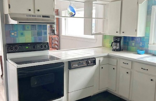 Inside, you’ll find a fully equipped large kitchen ideal for home-cooked meals, a cozy living room with a large-screen TV, and a dining room with a stunning view. Original artwork, antique furnishings, and thoughtful details throughout add warmth and character. The three bedrooms—one queen and two full beds—comfortably sleep up to six guests. Both bathrooms are fully appointed: one with a tub/shower combo, the other with a walk-in shower, each stocked with plush towels and a hair dryer.