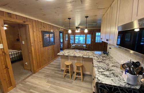 Additional amenities include an all-aluminum private pier w/ plastic rub rails to protect your boat, lawn furniture, picnic tables, Weber charcoal grill, sand beach, fire pit, and a lighted fish cleaning house w/ additional freezer storage. Cabin is equipped with Wifi, a TV, Blu-Ray player, and plenty of movies on-hand.