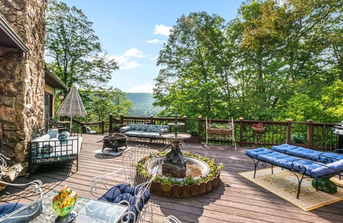 European-inspired villa in Roxbury, NY. This extravagant vacation rental home offers luxurious decor and furnishings from across the globe to help you experience a personal and opulent haven like no other. 2 bedrooms, 2.5 bathrooms, 2 fireplaces, an outdoor tub, a master bedroom with ensuite 2 person jacuzzi, gorgeous wooded views, fire pit, 2 private decks, and gas BBQ, sleeping deck with an Italian fountain, 5 person Hot Tub and a multi-faith meditation chapel in a separate building.