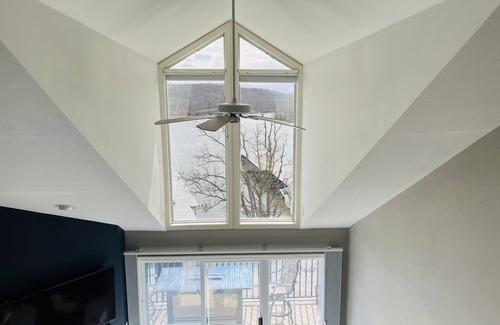 Incredible views from an updated condo nestled in the State Park ( MM5 of the Grand Glaize) just a 2 min boat ride to PB 2 . Boat slip available based off of availability. If you are looking for water sports and relaxation we are located around the bend from cliff jumping and a 15 minute boat ride to Back Water Jacks in the heart of Osage Beach. By land you are surrounded by State Park hiking trails for all levels, horseback riding and some of the best fishing the lake has to offer. Inside we are the top floor unit with vaulted ceilings giving you a phenomenal view of the lake from every angle. Sit on the deck and watch the Eagles soar, the deer come in at night or the boats floating by. The Master Bedroom is a walkout to the deck and an incredible view of the sunrise from bed. A full master bathroom is attached. The main floor has an open floor plan allowing views from every direction. There is a 2nd bedroom on the main floor as well as a bathroom that sits off the living room. Upstairs is a spacious loft with 2 queen beds and a bathroom and a shower and washer and dryer. This loft is the 3rd bedroom thanks to a set of accordion dividers that close it off for privacy when needed but again open allowing spectacular views of the lake. An added feature in the loft is the “Captains Quarters” which is a small attached room witth a twin bed and privacy.