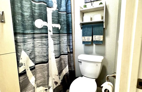The sea-themed bathroom invites you to unwind in a walk-in shower, complete with toiletries to kickstart your stay. Every detail is carefully curated to enhance your comfort and ensure a rejuvenating experience.