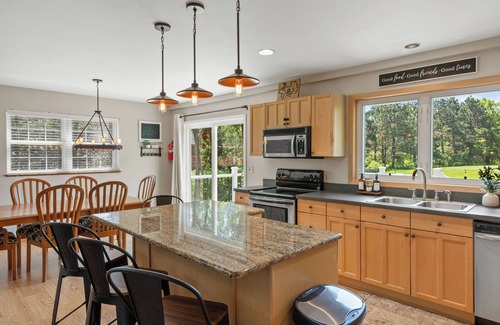 Step inside our inviting home, and you'll find a comfortable and stylish living room featuring a cozy gas fireplace, perfect for gathering and unwinding after a day of adventure. The fully equipped kitchen allows you to prepare delicious meals, with modern appliances and ample counter space for your convenience.