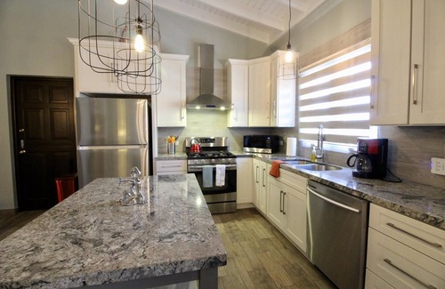 Welcome to Casa Tranquila where there is no pressure to do anything! She’s a beauty with 3 bedroom and 3 bathroom Aruban style home with vaulted ceilings and a heated pool. She has an amazing kitchen for preparing culinary delights when you don’t feel like venturing out to the restaurants. Downstairs bedrooms have pool views and direct access to your private paradise. Her pool has a swim up bar and outdoor TV for viewing netflix or sporting events. Upstairs you will find 2 comfy queen size beds and a private full bath. You may never want to leave your personal paradise, but when the beach calls we provide a cooler and beach chairs. Don't be fooled by the map. Aruba is only 6 miles wide and 20 or so long. We are just a straight 3 mile drive to Palm Beach and equally close to downtown Oranjestad. Parking at the beaches in Aruba is easy. A perfect location for your Aruban getaway.